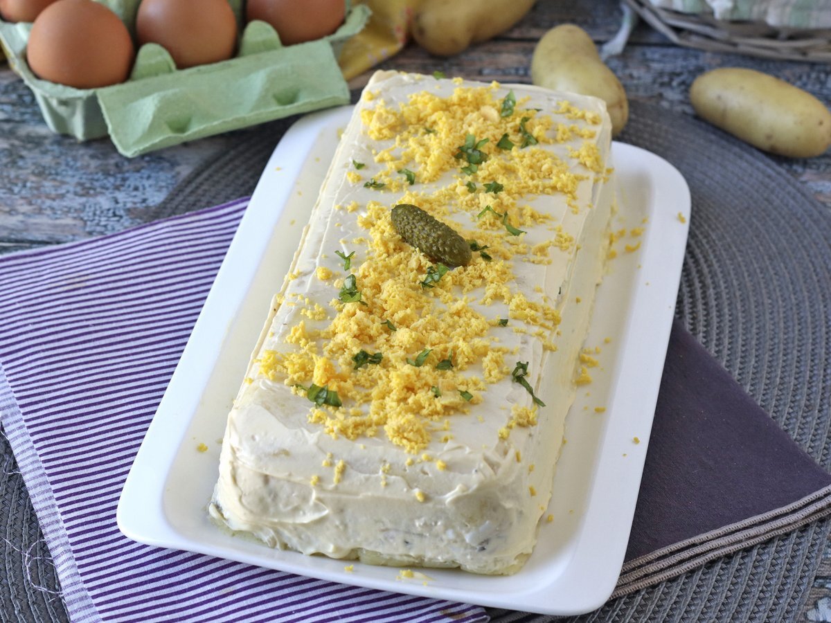 Diese kalte Kartoffel-Thunfisch-Pastete liegt irgendwo zwischen einem russischen Salat und einer Eier-Mimose. Wir haben ihn mit einer sehr einfachen Basis zubereitet: gekochte Kartoffeln, Thunfisch, Essiggurken und Mayonnaise. Dieser kalte Kartoffel-Thunfisch-Mayonnaise-Kuchen vereint das Beste aus russischem Salat und Mimosen-Eiern. Gute, altmodische Zutaten, die leicht zu finden sind und perfekt zusammenpassen. Das Beste an diesem Rezept ist, dass es sich leicht an Ihre Vorräte und Ihren Geschmack anpassen lässt: Sie können geraspelte Karotten, gekochtes Gemüse, einen Hauch Senf oder was immer Sie möchten hinzufügen. Es handelt sich um eine einfache, schmackhafte und schnelle Vorspeise, die in weniger als 30 Minuten fertig ist und im Voraus zubereitet werden kann. Alles, was Sie tun müssen, ist, Schichten zu formen und sie ruhen zu lassen: Es könnte nicht einfacher sein.