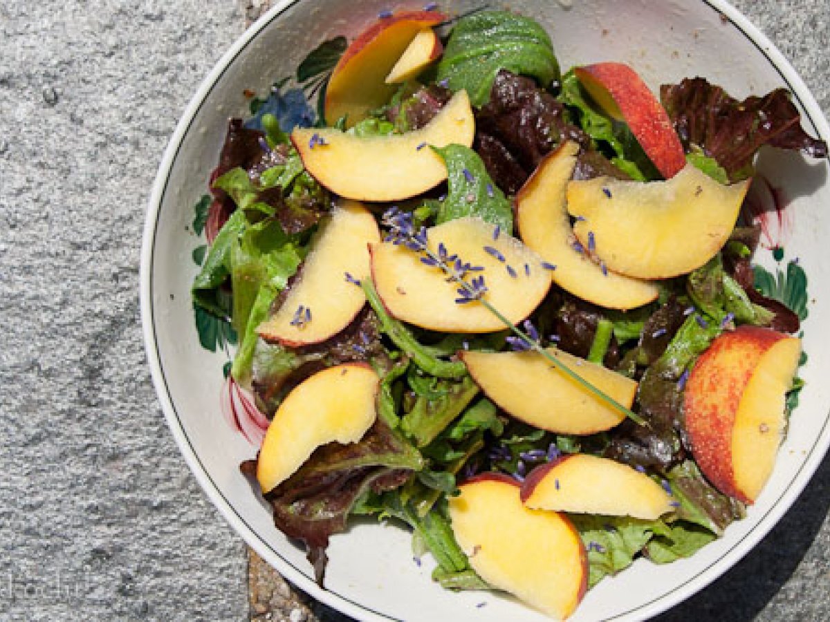 - Den Salat samt dem Pfirsich in einer Salatschüssel mit dem Dressing vermischen. Den Lavendel behutsam darüber streuen.