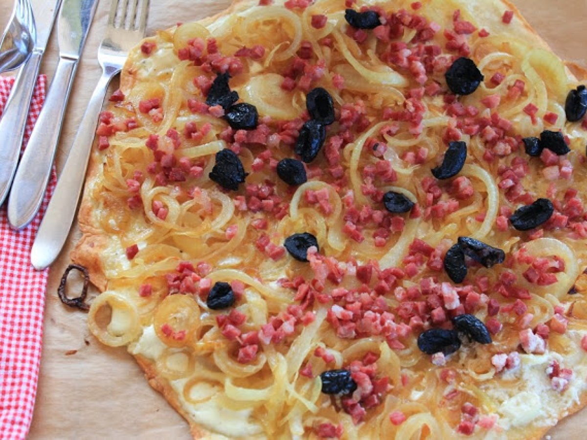 - Den Teig mit der Schmandcreme bestreichen und mit Zwiebeln, Speckwürfeln und schwarzen Oliven belegen. Den Flammkuchen mit dem Backpapier in den Ofen schieben.