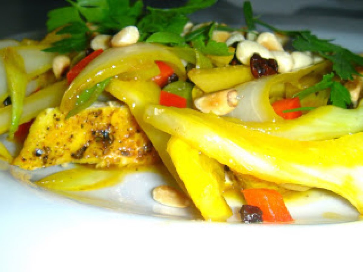 Frischer Fenchel und grob gehackt kurz greifen deutlich, mit denen die verschiedenen Salat-Dressing-Mix. - Mit Pignoli oder geröstete Mandeln, gehackt Chilies, Rosinen, Zitronen Bands Salz, Petersilie und servieren warme Hähnchenbrust.
