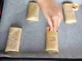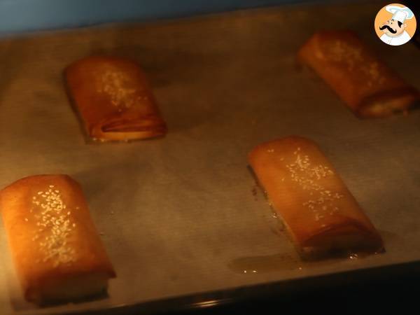 Legen Sie die gewickelten Feta-Stücke auf Backpapier und streuen Sesamsamen darauf.