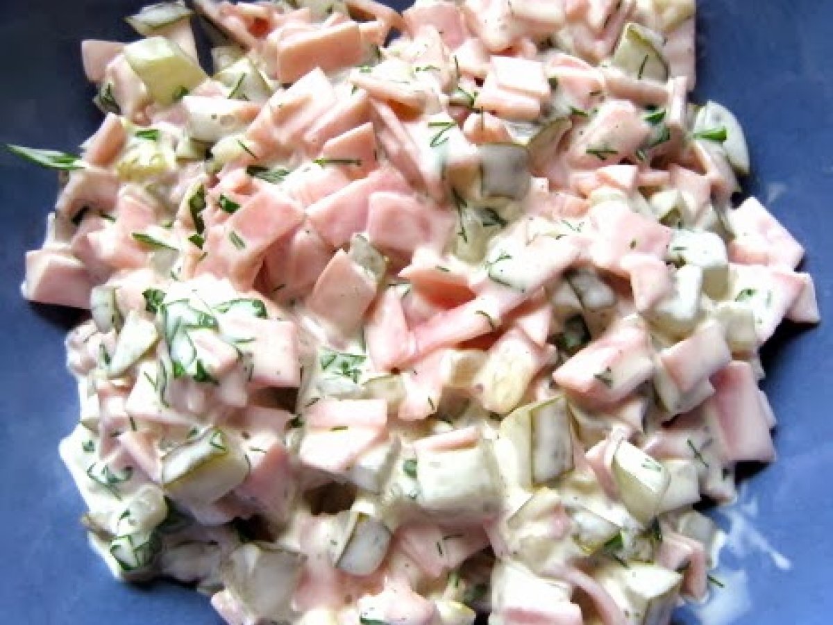 - Fleischsalat enthält entweder Schinken oder Fleischwurst, eingelegte Gurken und Mayonnaise.