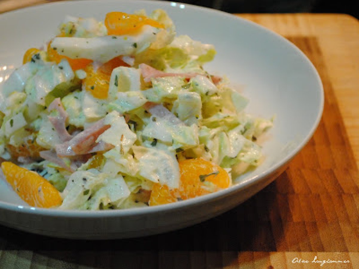 - Cut Schinken in Streifen schneiden und mit Kohl und Mandarinen mischen.