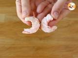 Die Karotte waschen und schälen und dann mit einem Sparschäler in Streifen reiben. Blätter vom Kopfsalat abschneiden. Garnelen der Länge nach halbieren.