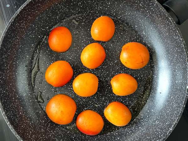 Die Aprikosen mit einem Schuss Olivenöl in einer heißen Pfanne anbraten.