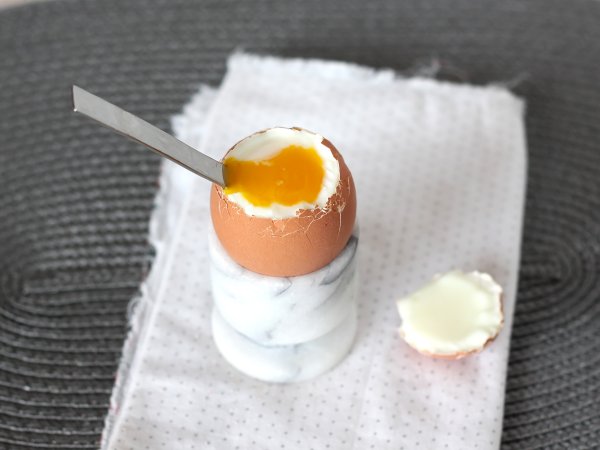 - Lassen Sie Ihr Ei abtropfen und geben Sie es in einen Eierbecher. Schneiden Sie mit einem Messer um das Ei rum und guten Appetit!
