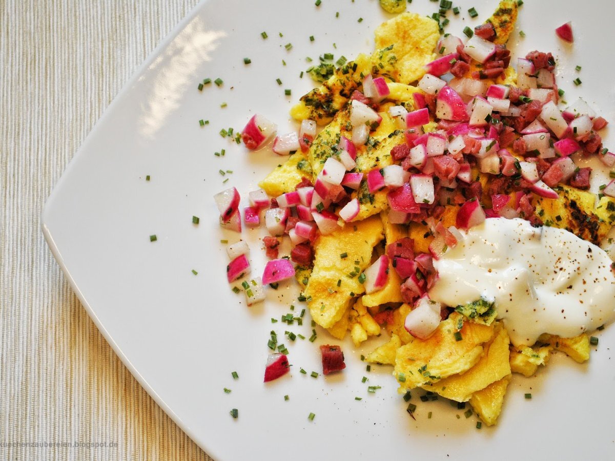 - Die gebratenen Radieschen und den Schinken darüber verteilen und - wenn man mag - mit einem Klecks saurer Sahne servieren.