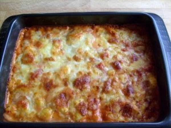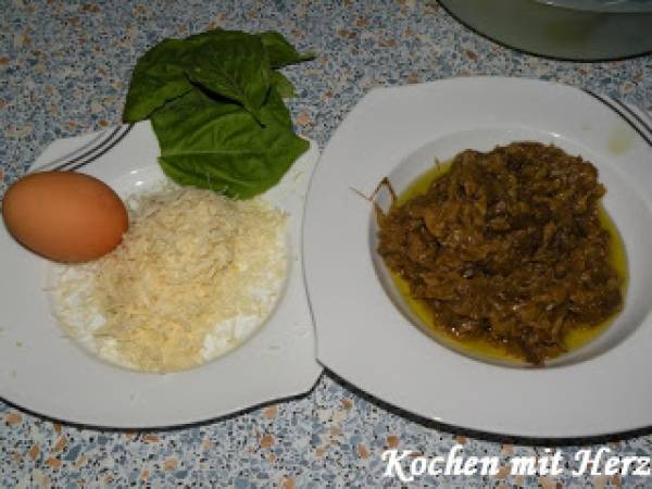 Sobald sie abgekühlt sind in einer Schüssel zusammen mit dem Ei, Salz, Pfeffer, Basilikum, 3 Esslöffel Parmesan und dem Mehl zu einem Teig verkneten.