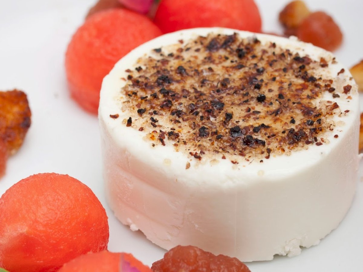 Gratinierter ziegenkäse mit melone, rose und sumach