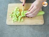 Die Gurke schälen und dann der Länge nach in 4 Stücke schneiden. Anschließend in Scheiben schneiden.