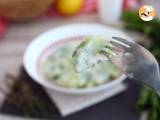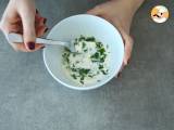 Die Sauce zubereiten: Einen Naturjoghurt mit dem Saft einer halben Zitrone, einer Prise Salz, einer Prise Pfeffer und einer Handvoll gehackter Petersilie verrühren.