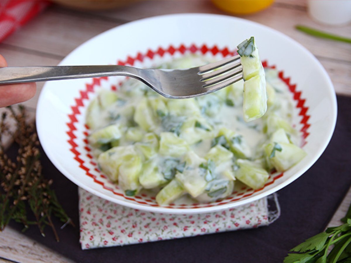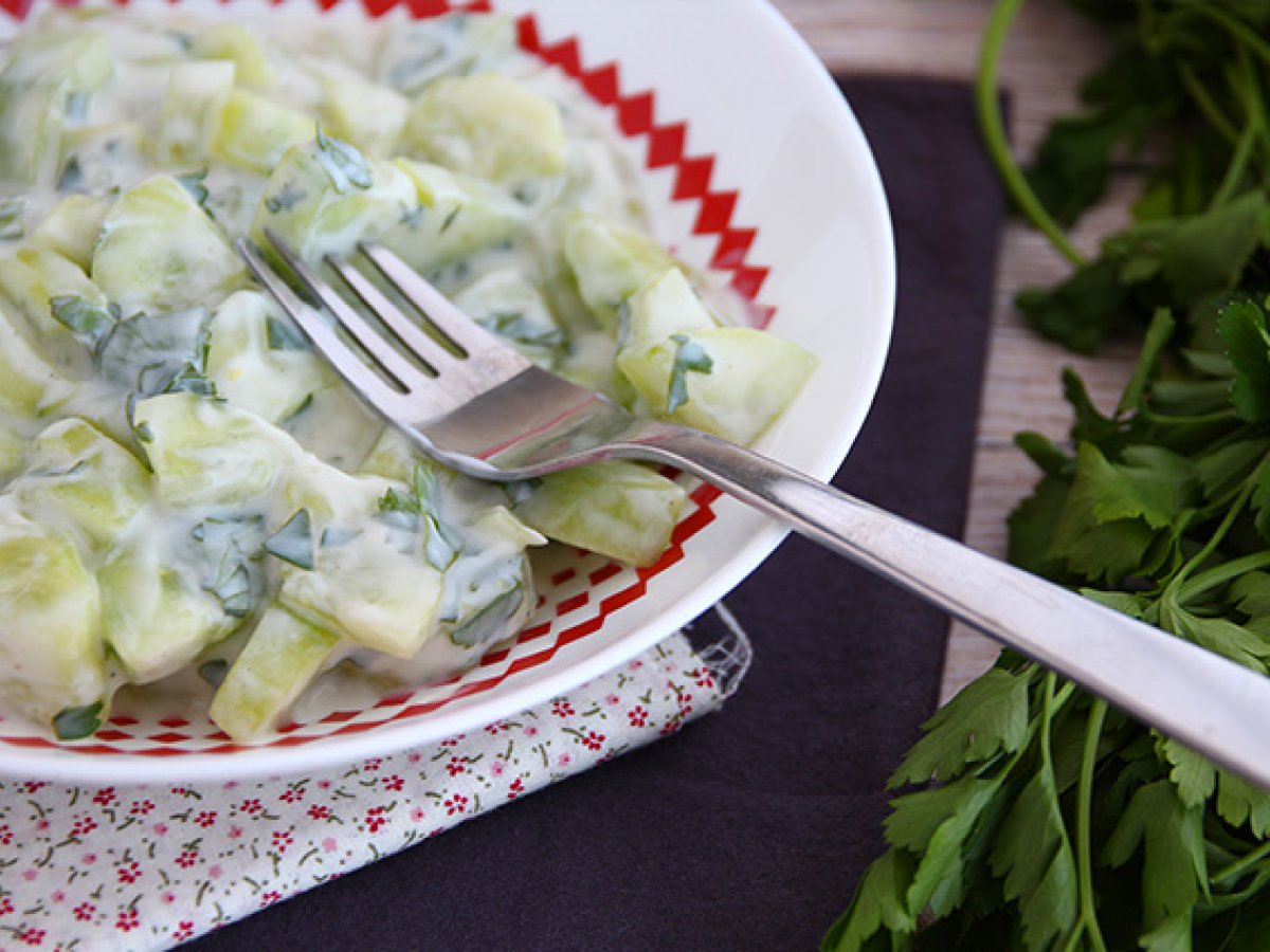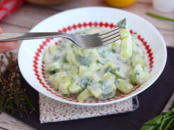 Verschönern Sie Ihren Gurkensalat mit einem Joghurtdressing! Einfach, schnell, cremig und schmackhaft - hier haben Sie den Beweis, dass einfache Rezepte sehr oft die besten sind! Ein Salat, der der ganzen Familie schmecken wird :-)