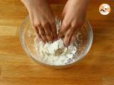Den Teig etwa 5 Minuten lang kneten und dann eine Kugel formen. Die Kugel in Folie einwickeln und mindestens 30 Minuten bei Zimmertemperatur ruhen lassen.