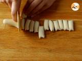 Aus dem Teig eine Wurst mit etwa 5 cm Durchmesser formen. Schneiden Sie zwischen 15 und 16 gleich große Stücke. Decken Sie alle Teile mit Frischhaltefolie ab.