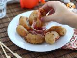 In einer Fritteuse oder in einem ziemlich tiefen Ölbad kochen. Etwa 4 Minuten einwirken lassen oder bis der Teig goldbraun ist.