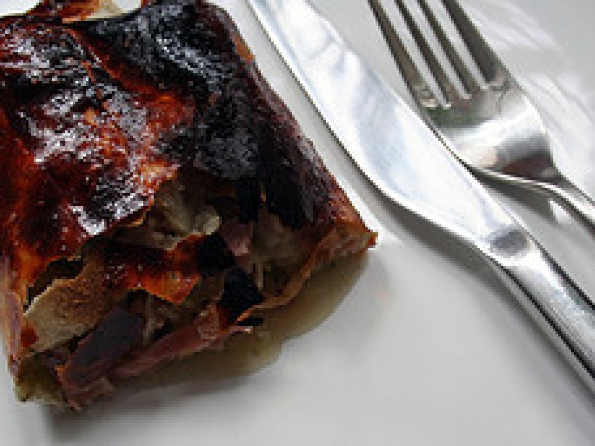 Grate Käse-Mischung. - Strudelteigplatte verteilt mit einem feuchten Tuch, Ort, mit zerlassener Butter oder Öl bestreichen, die zweite Platte überlappend.
