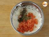In einer Schüssel Frischkäse, Ricotta und 3 in Stücke geschnittene Scheiben Räucherlachs vermischen. Mit Salz und Pfeffer würzen und etwas Dill und Schnittlauch hinzufügen.