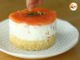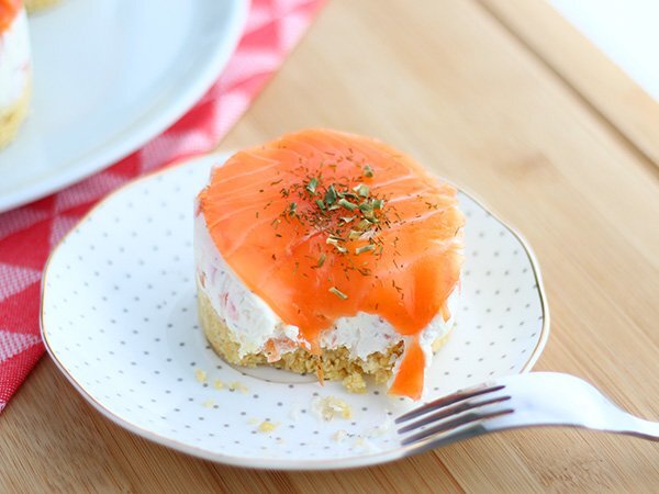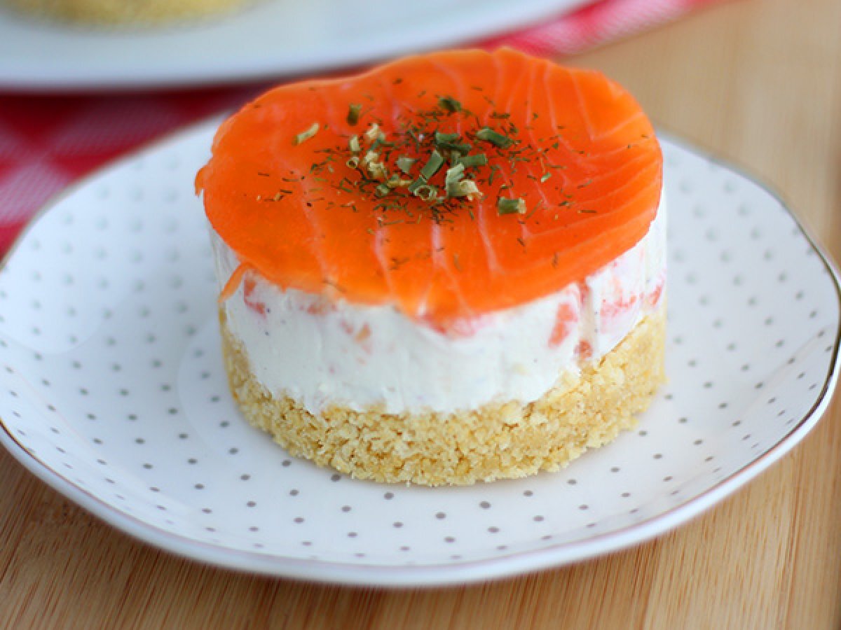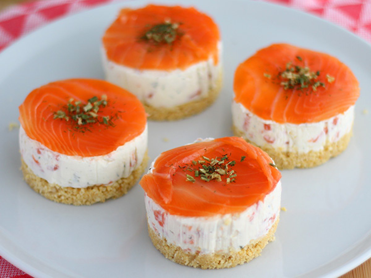Legen Sie einen Kreis Lachs auf einen zuvor aus der Form genommenen Käsekuchen und bestreuen Sie ihn mit Dill und Schnittlauch. Et voilà, Ihre Lachs-Käsekuchen sind fertig!