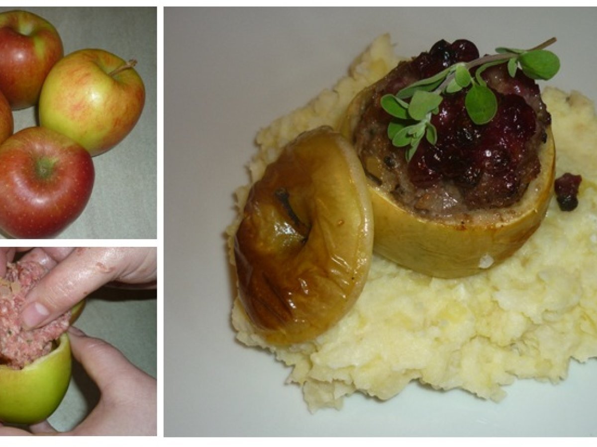 - Die Füllung in die ausgehöhlten Äpfel geben. Diese in eine Auflaufform stellen und je mit einem Preiselbeer-Butter-Flöckchen bedecken und mit einem Stück frischen Majoran garnieren.