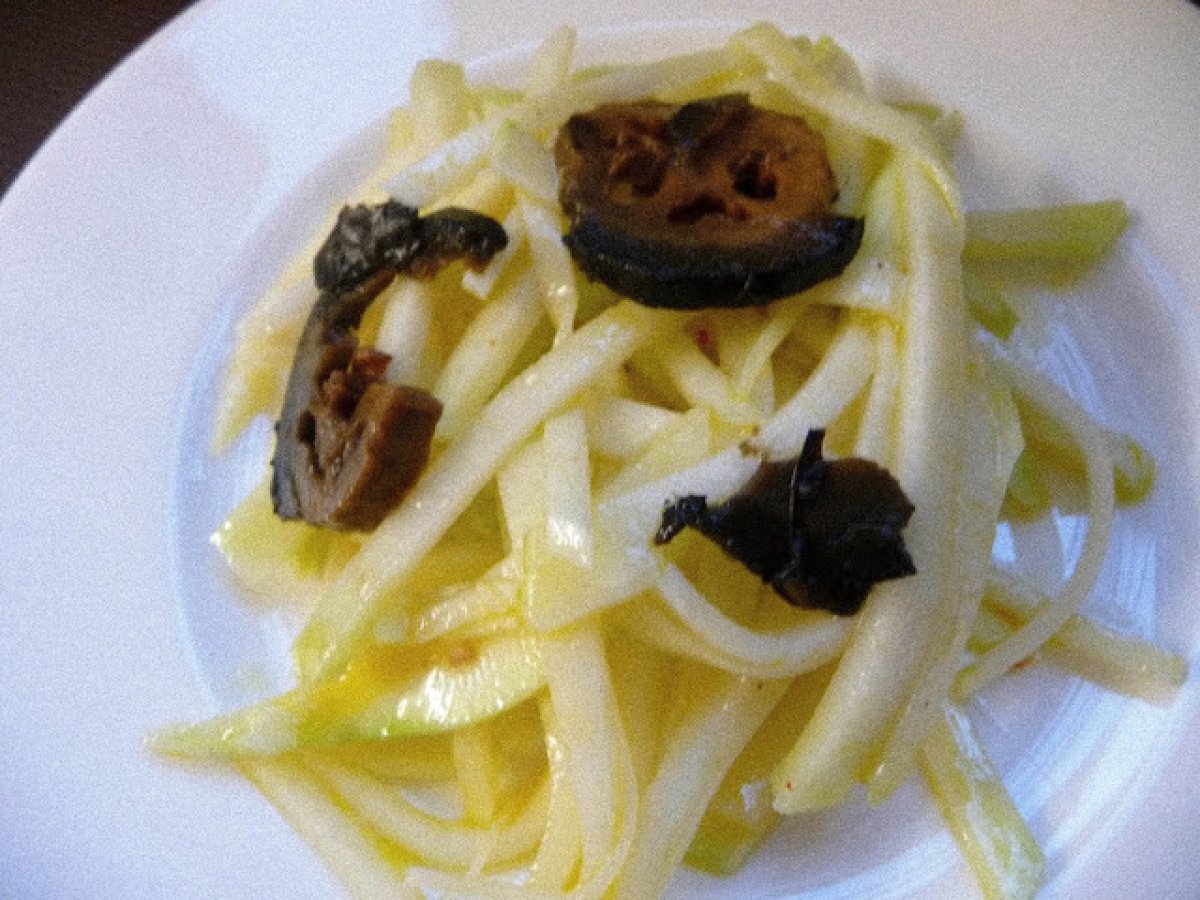 - Schwarze Nüsse in feine Scheiben und Würfel schneiden.