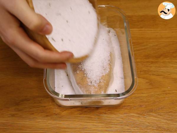 Grobes Salz, Zucker und Thymian mischen und die Hälfte der Mischung in die Schüssel geben. Die Foie gras darauf legen und mit der anderen Hälfte der Mischung bedecken. Filtern und mindestens 36 Stunden kühl stellen.