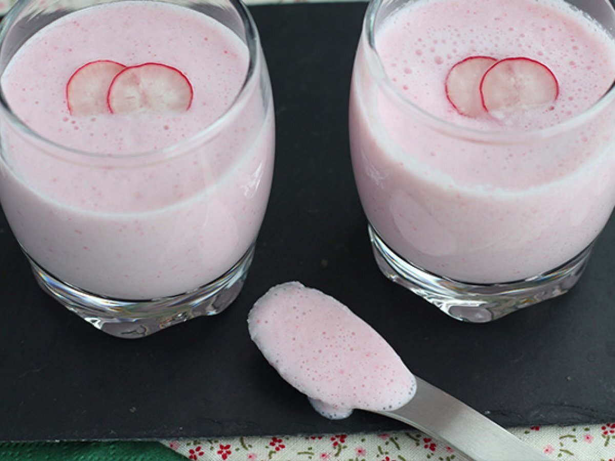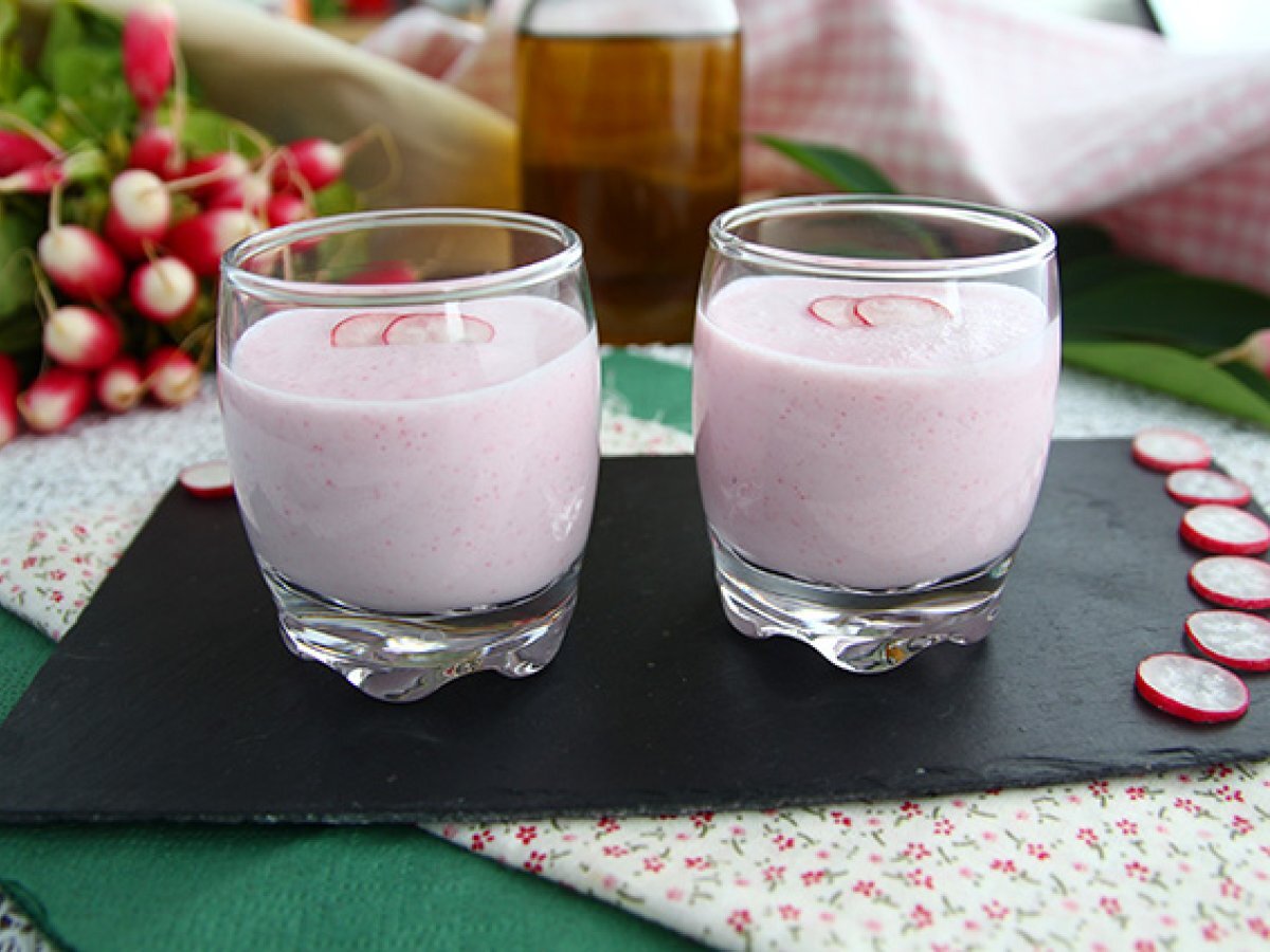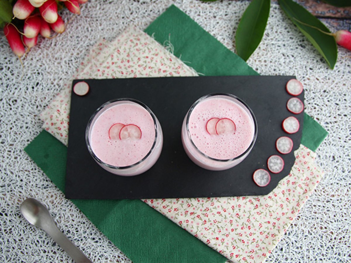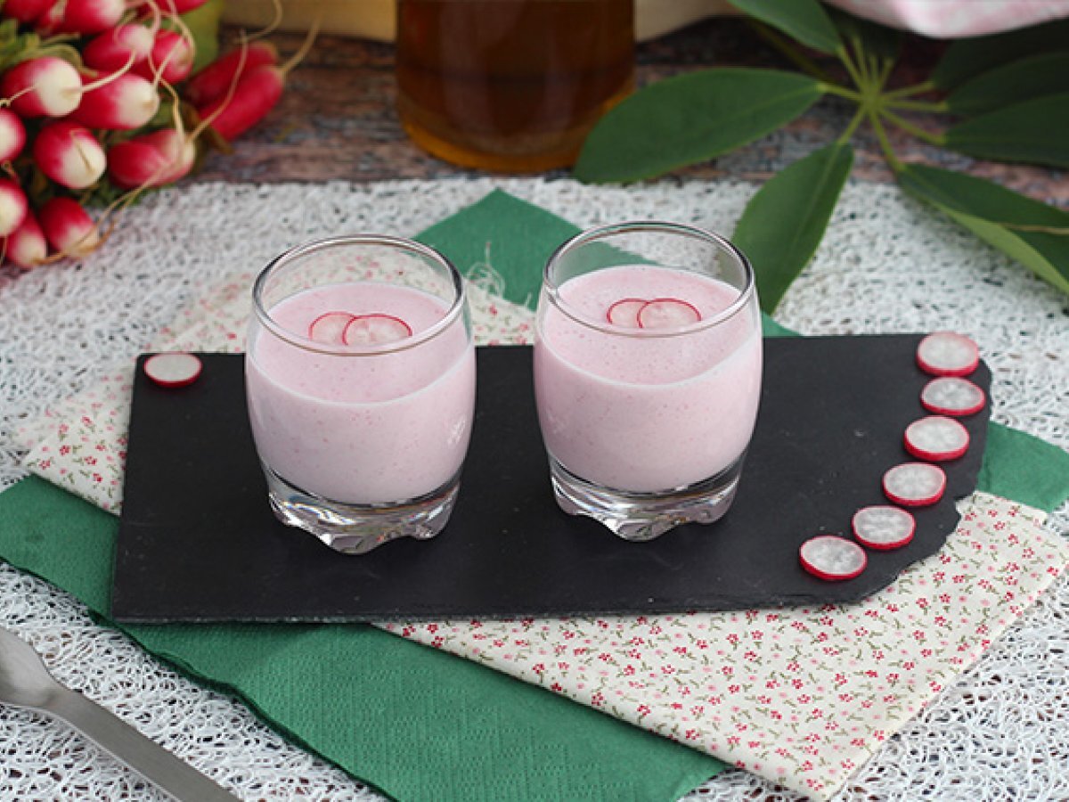 In kleinen Gläsern servieren und dünne Radieschenstreifen darauf legen. Fertig!