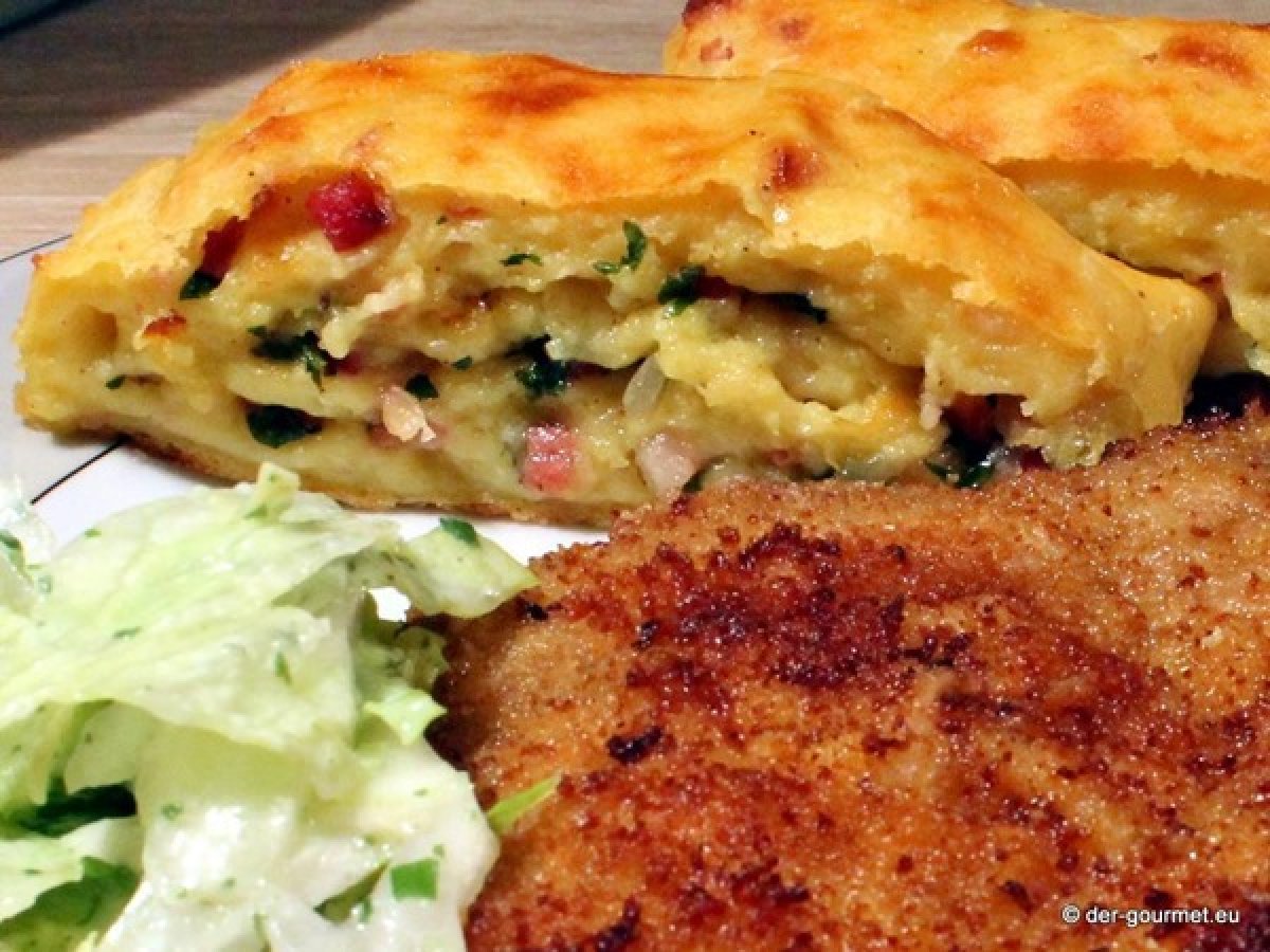 - Backofen auf 185 Grad Ober-/Unterhitze vorheizen. Kartoffeln durch eine Presse drücken, mit Salz, Pfeffer, Muskat abschmecken Eigelb unterrühren, mit Mehl und 10g Butter zu einen Teig verarbeiten. Die hälfte der Speckmasse einarbeiten.