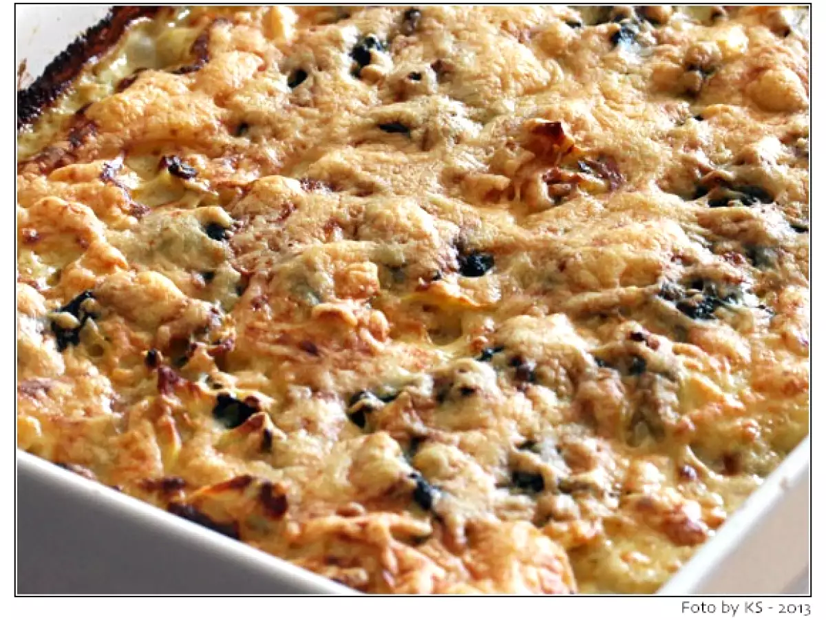 - Tragen Sie eine Schicht Kartoffelscheiben in der Backform, möglicherweise reiben etwas mehr Muskatnuss. Verteilen Sie den Spinat auf sie, ebenso wie die Türkei.