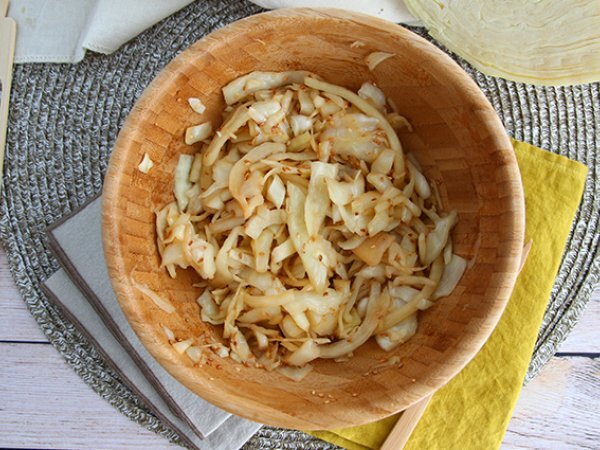 Den Kohl abtropfen lassen und gut ausdrücken, um so viel Flüssigkeit wie möglich herauszudrücken.
