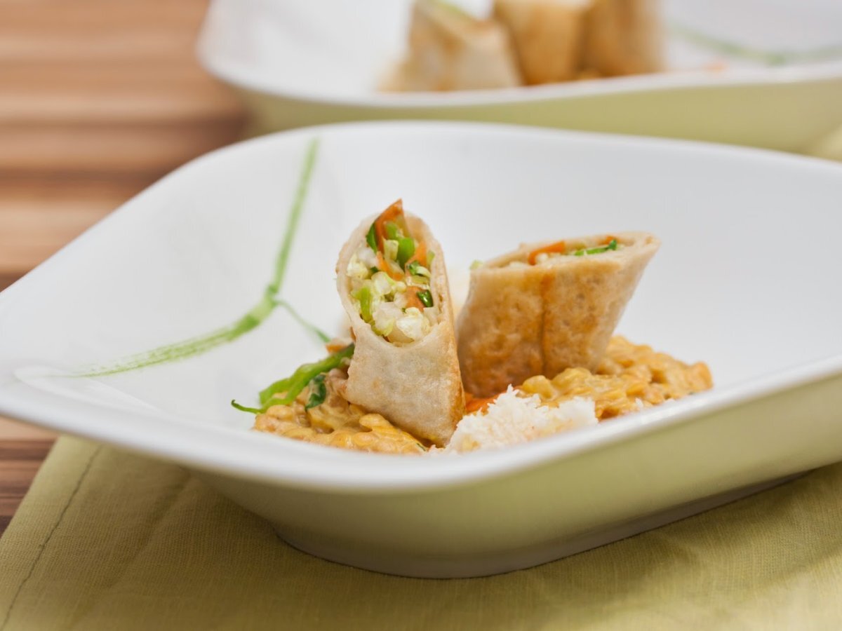 Kokospfannkuchen mit gemüse auf linsencurry