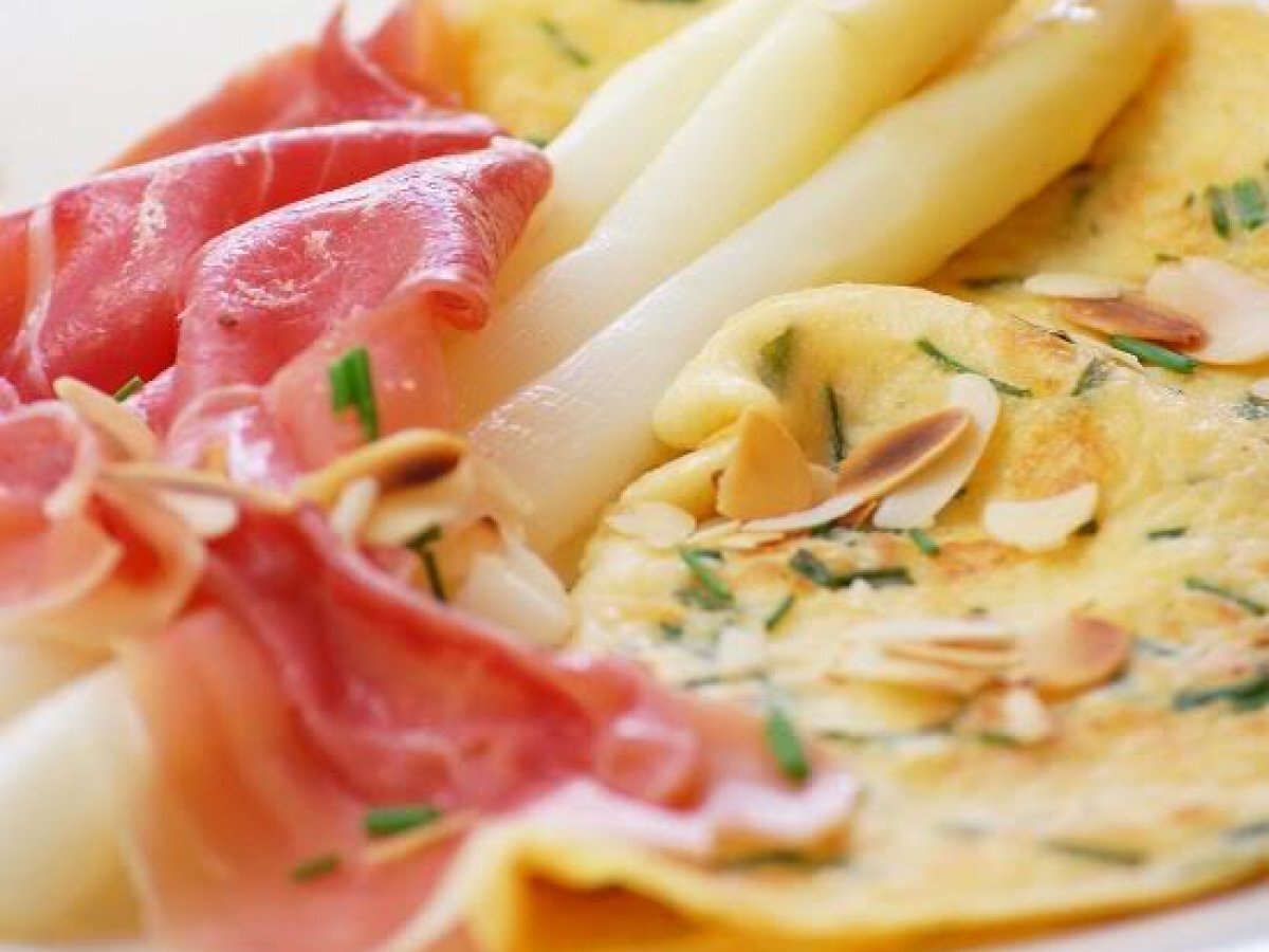 - Servieren Sie Pfannkuchen mit Spargel, Schinken und einige Mandelblättchen.