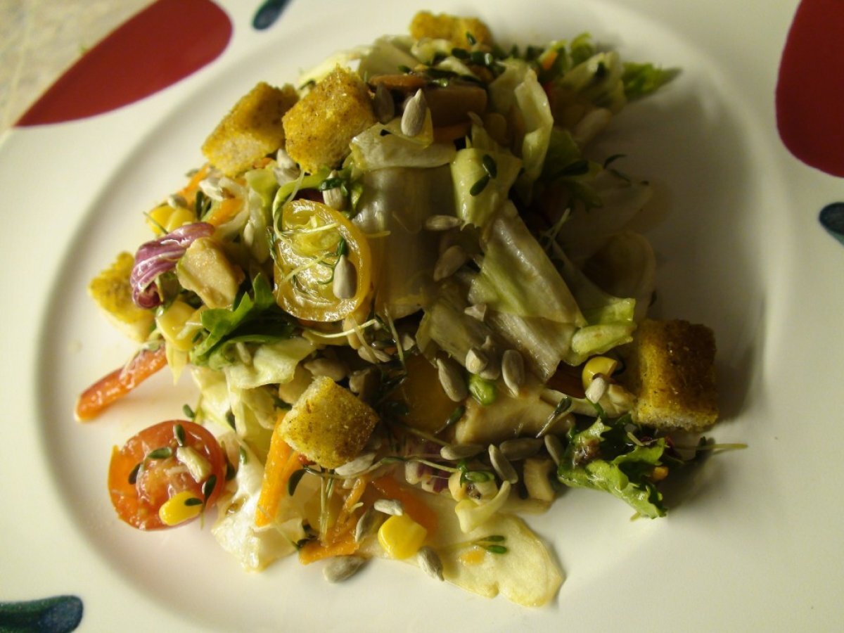 Kunterbunter salat mit asiatischem dressing und curry-croutons