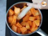 Die geschälten und geputzten Kürbisstücke dazugeben. Eine Minute anbraten.