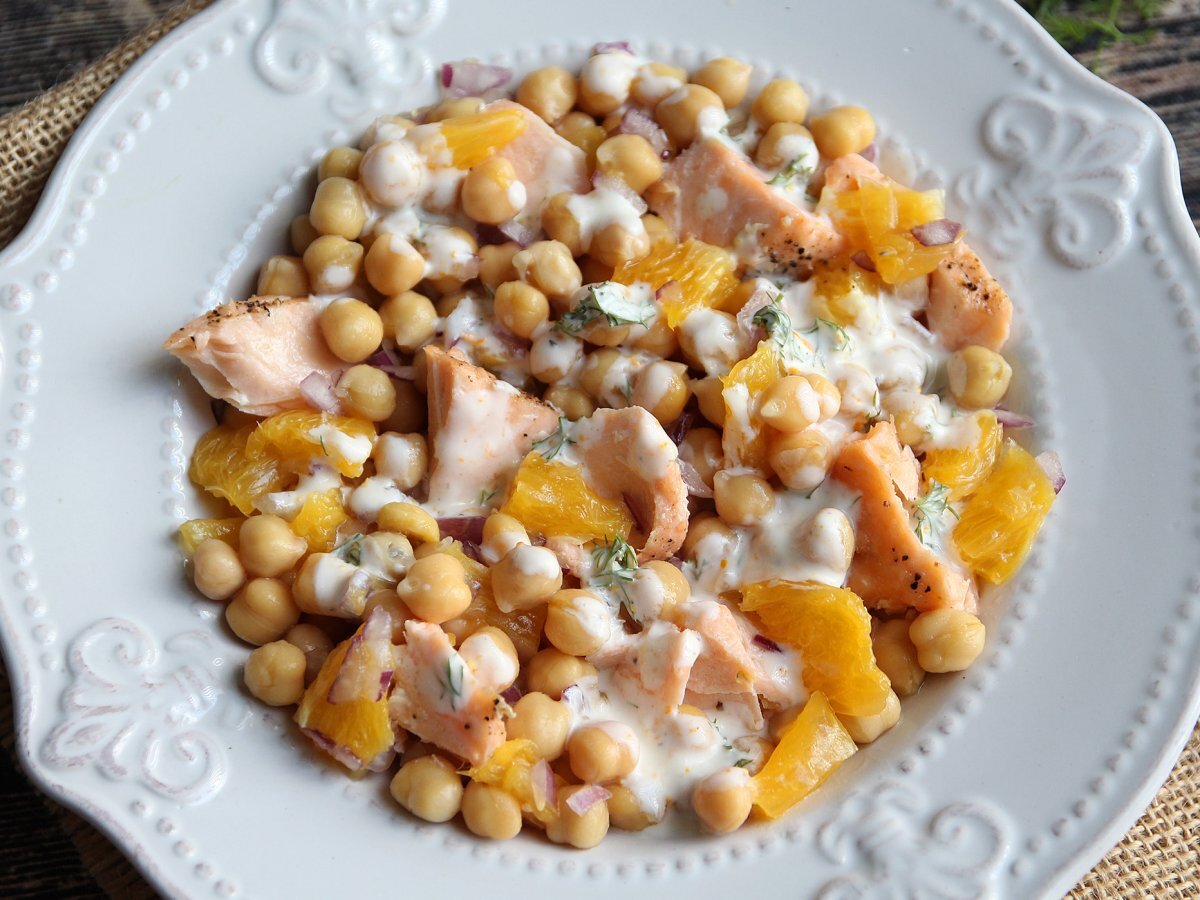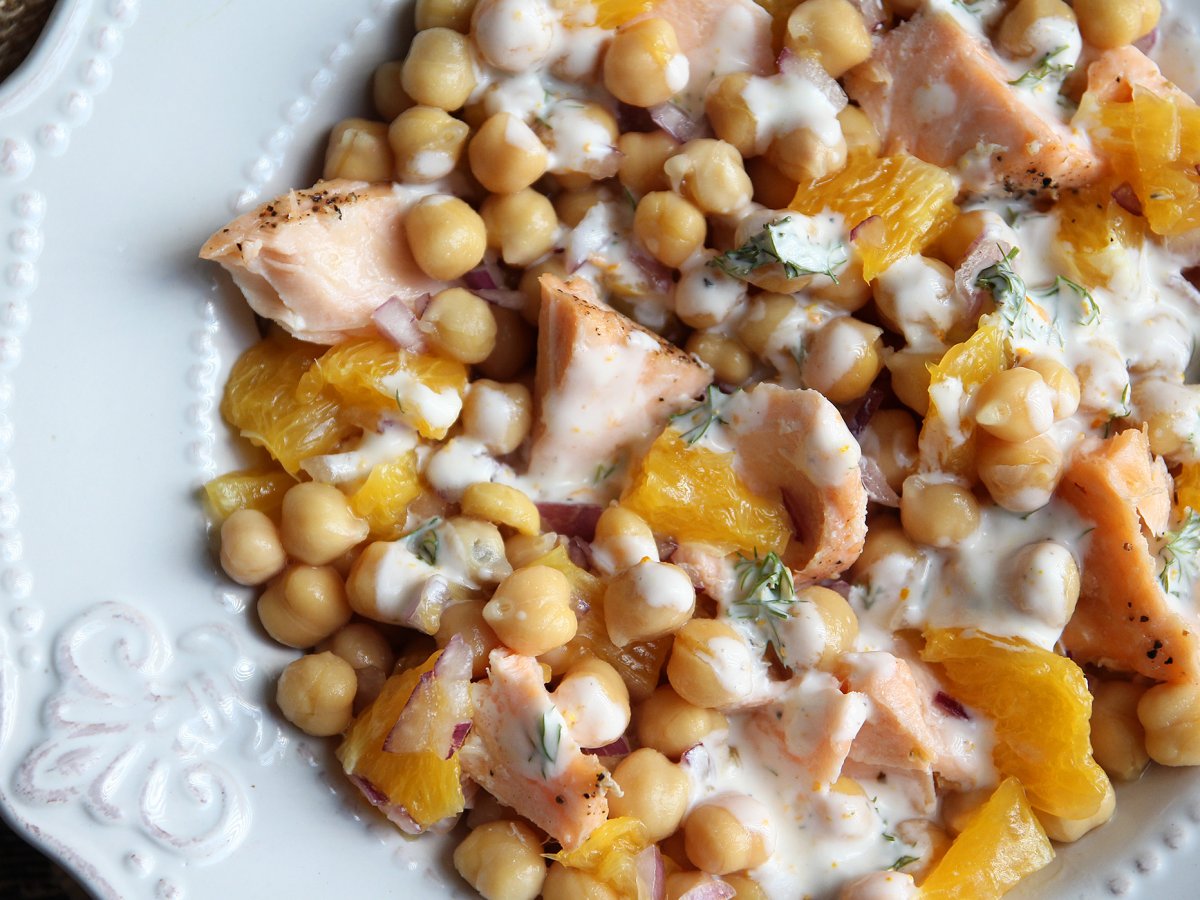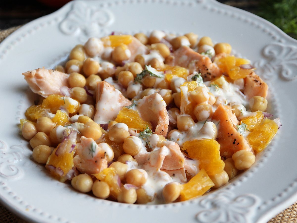 Möchten Sie einen Salat, der sich vom Gewöhnlichen unterscheidet? Probieren Sie unsere Kombination aus Lachs + Kichererbsen + Orange mit einem Hauch frischem Dill! Ein proteinreiches Gericht, das wir für eine gesunde und ausgewogene Mittagspause gerne mit zur Arbeit nehmen. Und was das Dressing betrifft, werden Sie unsere süß-salzige Kombination lieben. Wir lassen Sie es mit unseren Erklärungen unten ↓ versuchen