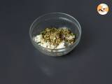 Geben Sie sie nun in eine Schüssel und fügen Sie den Ricotta, die gehackten Pistazien (einige davon für die endgültige Dekoration aufbewahren), den mit einer Schere zerkleinerten Schnittlauch, eine Prise Salz und etwas Pfeffer hinzu. Gut vermischen, bis eine glatte Creme entsteht