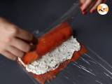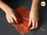 Nehmen Sie nun die Frischhaltefolie und legen Sie diese auf eine Arbeitsfläche. Legen Sie dann die ersten vier Lachsscheiben darauf und fügen Sie dann leicht überlappend die vier Scheiben hinzu (Sie müssen mit dem Räucherlachs ein Rechteck bilden).