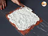 Beginnen Sie an der Seite des leeren Randes und versuchen Sie, es beim Vorwärtsgehen leicht festzuziehen. Sobald die Rolle fertig ist, wickeln Sie sie in Frischhaltefolie ein und lassen Sie sie mindestens zwei Stunden im Kühlschrank ruhen.