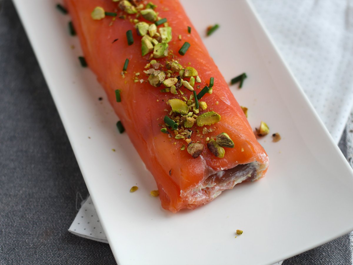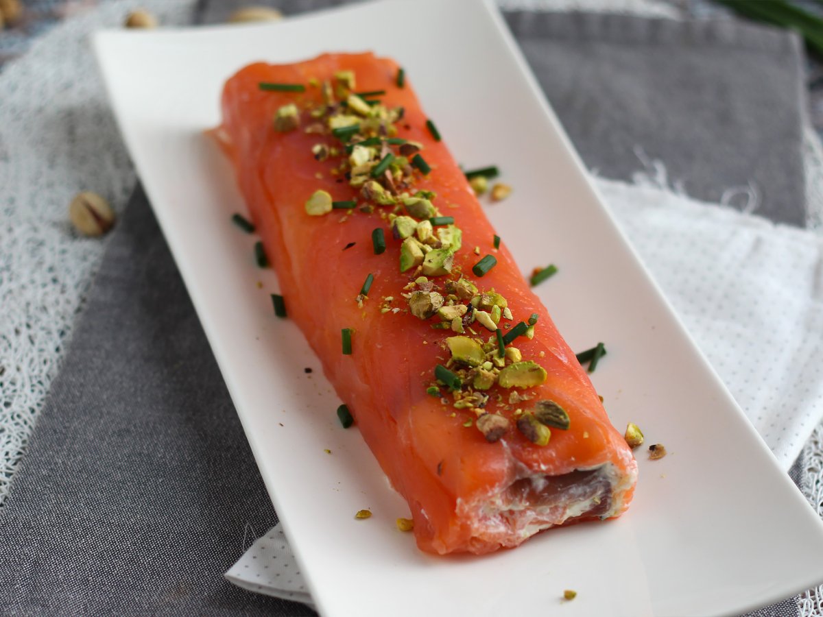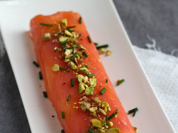 Nach dieser Zeit aus der Folie entfernen und die beiden Enden mit einem scharfen Messer abschneiden. In eine Servierschüssel geben und mit gehacktem Schnittlauch und gehackten Pistazien bestreuen. Fertig ist die gesalzene Lachsrolle!