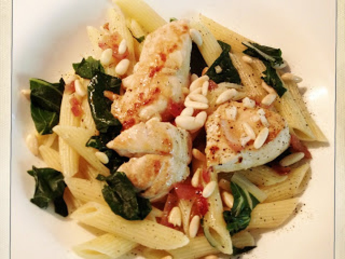 Mangold mit penne, hähnchenbrust und pinienkernen