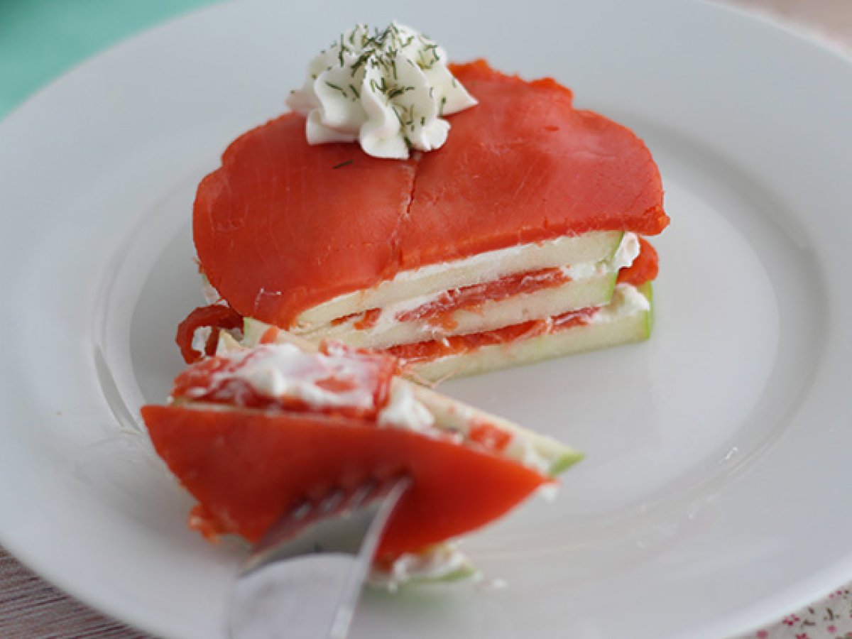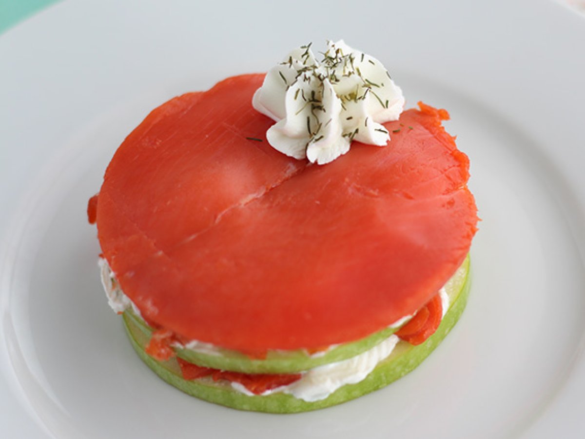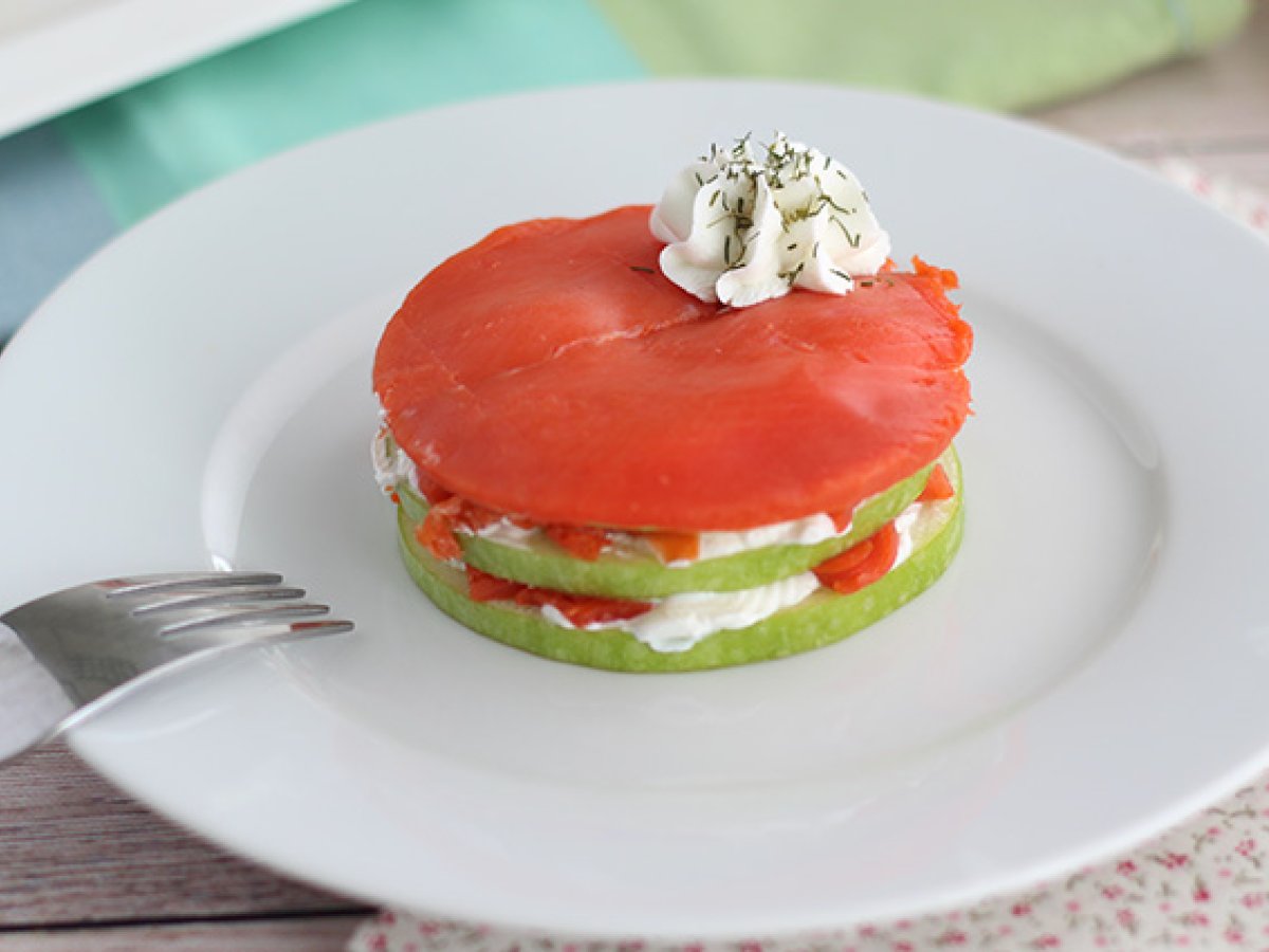 Wer hat gesagt, dass Mille feuilles automatisch süß sind? Wir beweisen Ihnen das Gegenteil mit dieser salzigen Version, die schön frisch ist und nicht gekocht werden muss! Für dieses einfache, glutenfreie Rezept benötigen Sie nur drei Zutaten: Lachs, Apfel und Ziegenfrischkäse. Bestreuen Sie das Ganze mit einer Prise Dill und schon ist es fertig ;-) Eine gute Idee, wenn Sie ein einfaches Rezept für ein Festtagsessen zubereiten möchten!