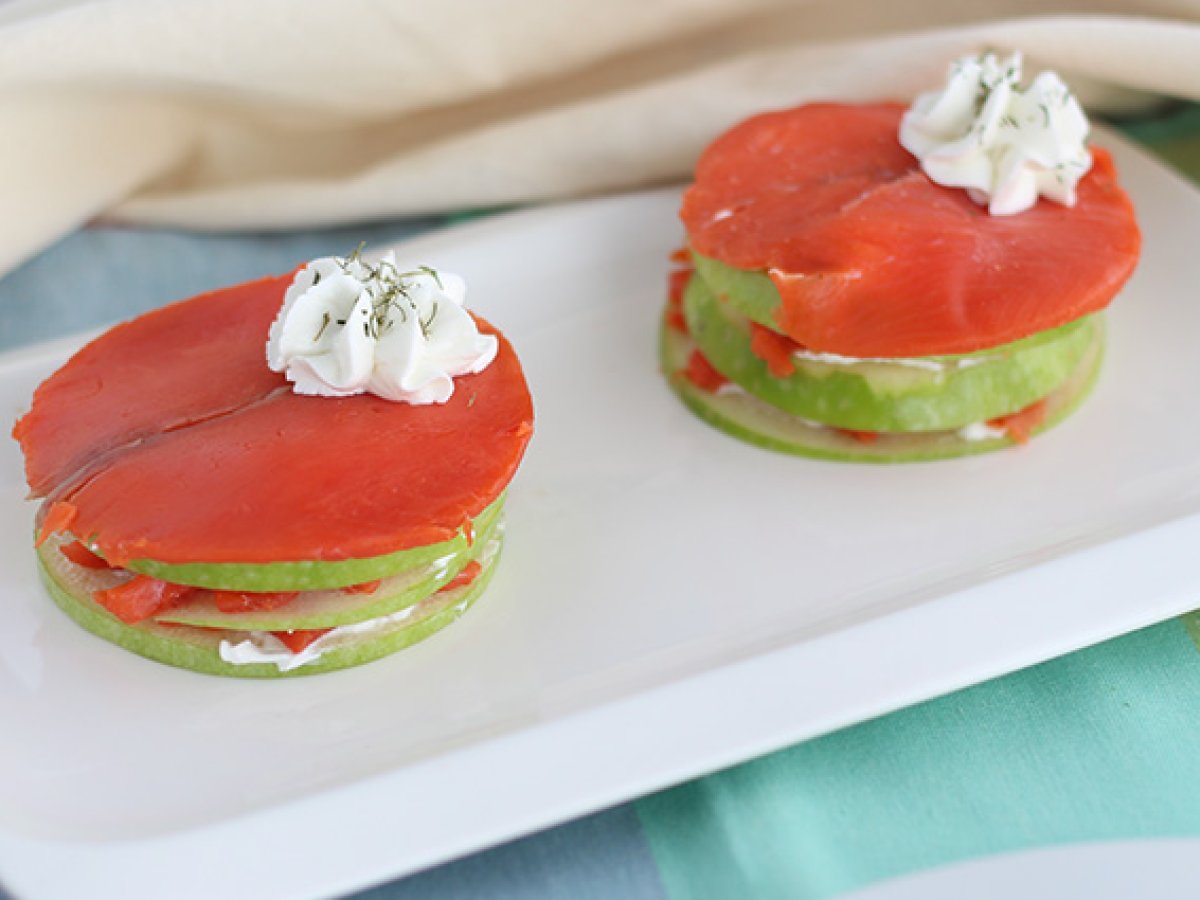 Legen Sie einige Stücke Räucherlachs auf den Frischkäse. Dann wiederholen Sie den Vorgang: Legen Sie wieder eine Apfelscheibe auf, bestreichen Sie sie mit Käse und legen Sie einige Stücke Räucherlachs darauf.
