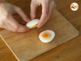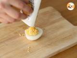 Kochen Sie Ihre Eier 10 Minuten lang in kochendem Wasser. Lassen Sie sie abkühlen, schälen Sie sie und schneiden Sie sie in zwei Teile. Sammeln Sie alle Eigelbe und legen Sie eines beiseite.
