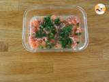 Den geschnittenen Lachs, Zitronensaft und Petersilie in eine Gratinform geben. Gut vermischen, mit Frischhaltefolie abdecken und 1 Stunde im Kühlschrank lagern.