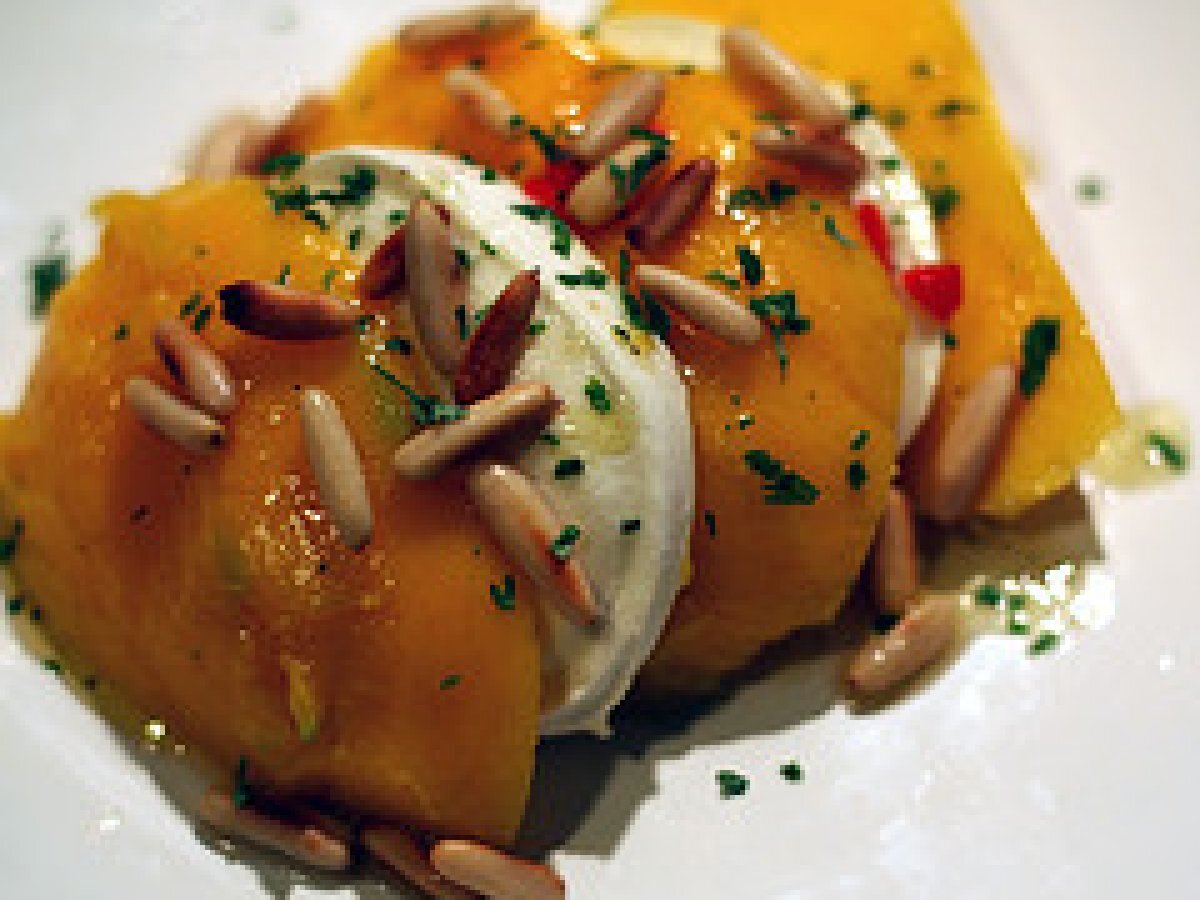 - Mozzarella und Mango in dünne Scheiben schneiden.