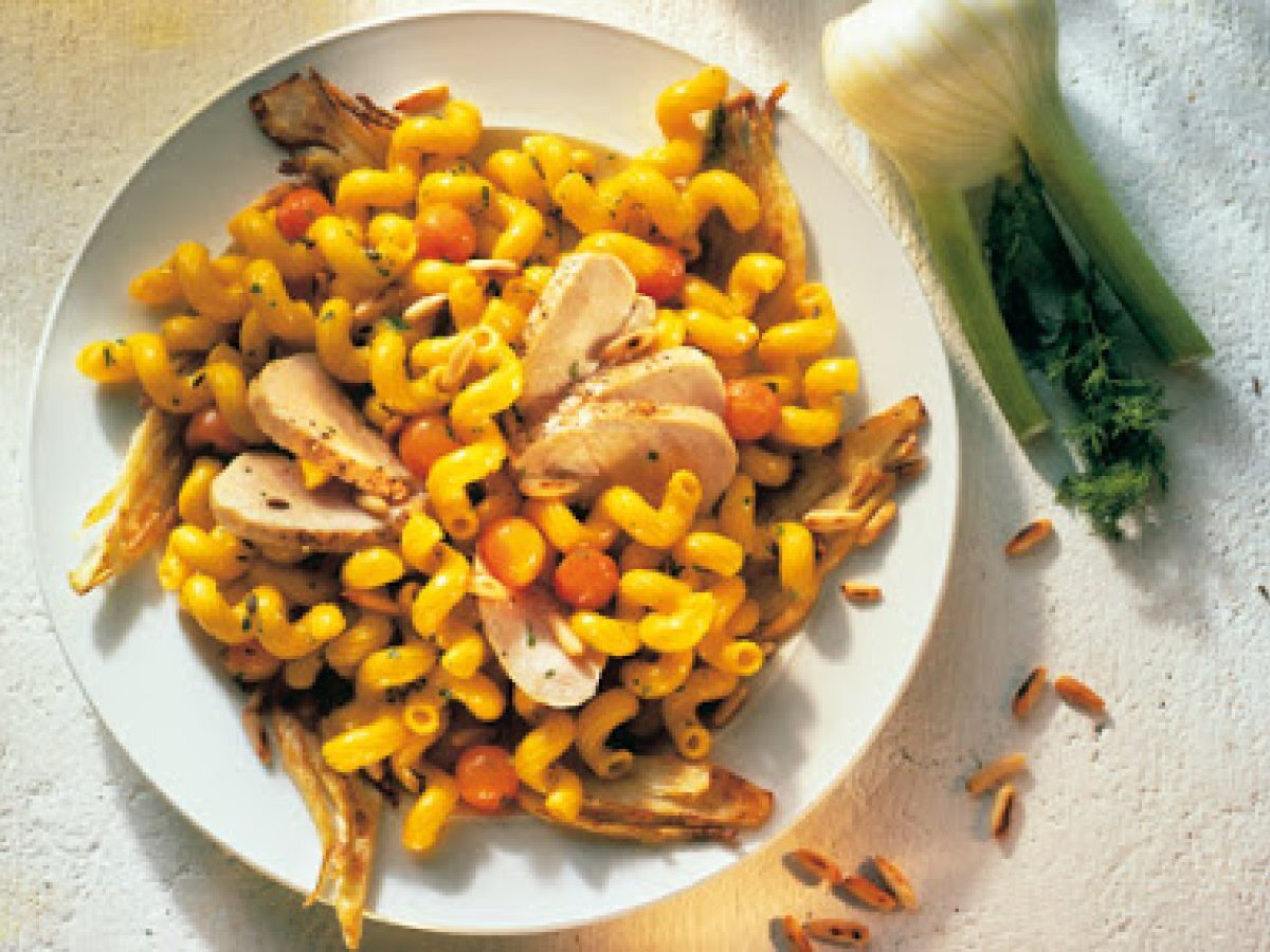 - Nudeln nach Packungsetikett, dann abtropfen lassen und ausspülen. Inzwischen, schneiden den Fenchel in dünne Scheiben schneiden und in einer Pfanne in heißem Olivenöl. Entfernen und warm halten.