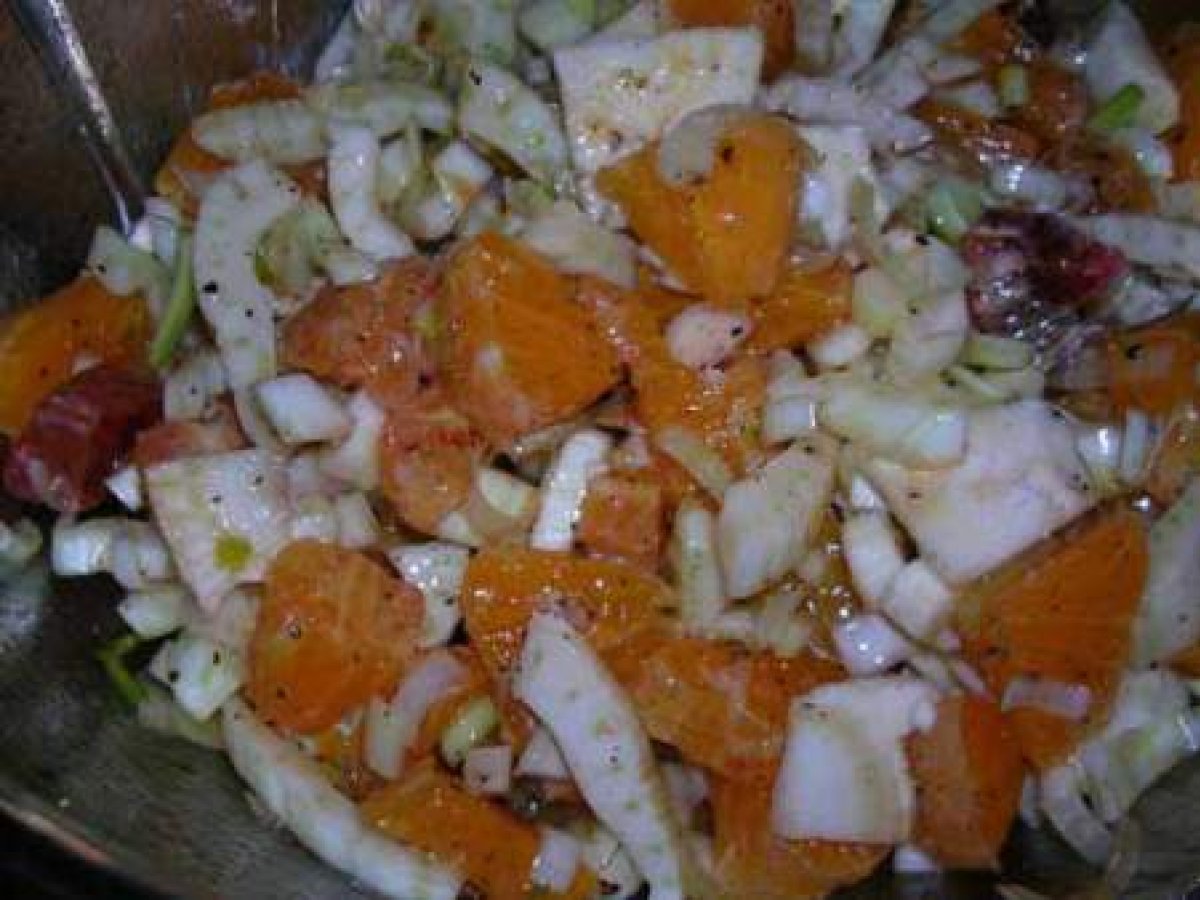 - Fruehlingszwiebeln in feine Ringe schneiden alles zusammen in eine grosse Schuessel geben und mit dem Saft einer Orange, einer halben Zitrone und Olivenoel vermischen.