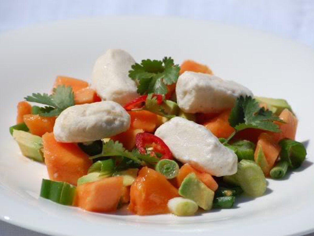 Halbierung der Papaya, entkernen, schälen und in Würfel schneiden. - Der Anwalt ebenfalls schälen und hacken. Paprika und Zwiebeln in dünne Scheiben schneiden.