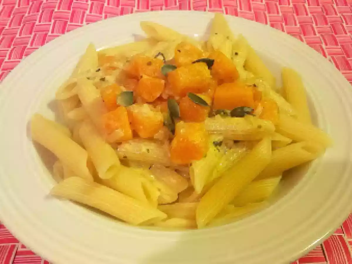 - Erstens, die Nudeln nach Richtungen für das Kochen zu verpacken. In der Zwischenzeit, schälen, entkernen und in kleine Würfel von Kürbis.