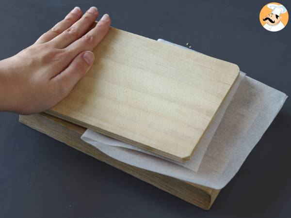 Ein Stück gebratene Banane auf ein Stück Backpapier legen, mit Backpapier abdecken und dann die Banane mithilfe eines Schneidebretts zu einer flachen Scheibe zusammendrücken. Den Vorgang mit den anderen Stücken wiederholen und die Scheiben mit Salz bestreuen.