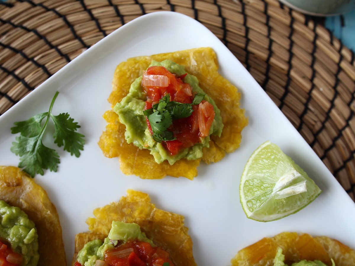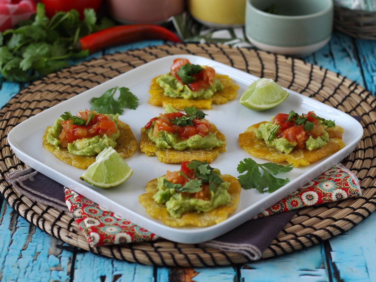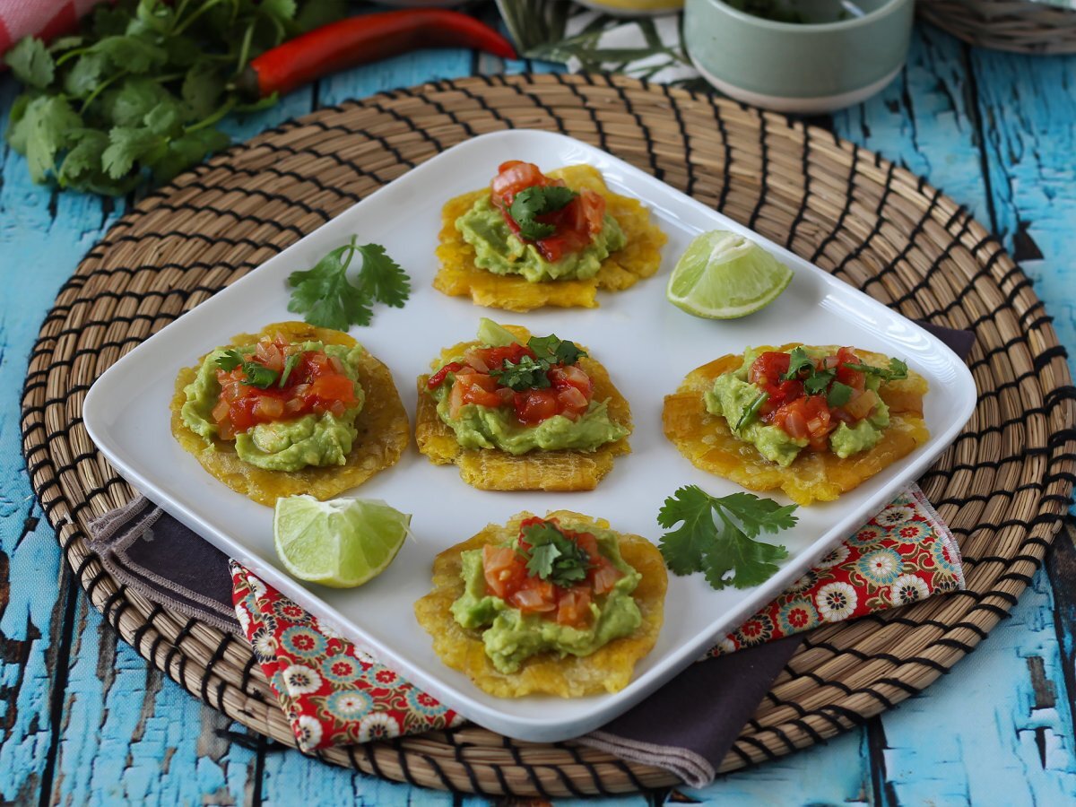 Patacones, kolumbianischer kochbananentoast mit guacamole und tomaten